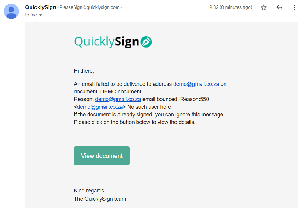 Should the signing request fail to deliver, you will receive an email notification advising you of the reason it has failed. (See example below)
