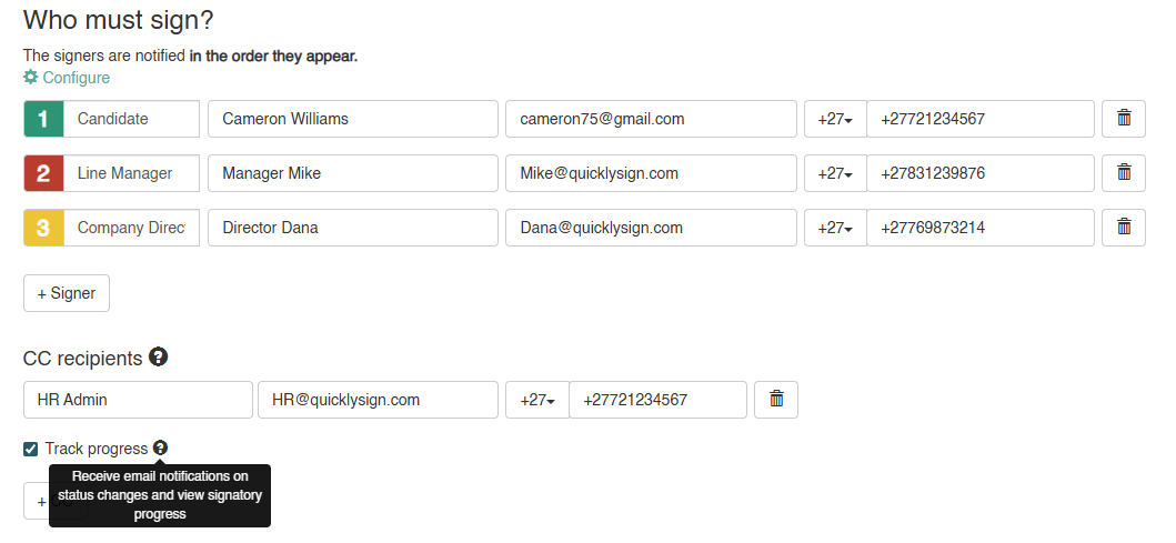 Final Copy Only - The CC recipient receives the completed document once all parties have signed. No visibility into the process while it is in progress. Simply add their details to the Name, Email and Mobile number fields but do not select the “Track Progress” configuration